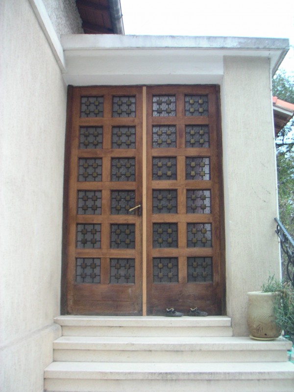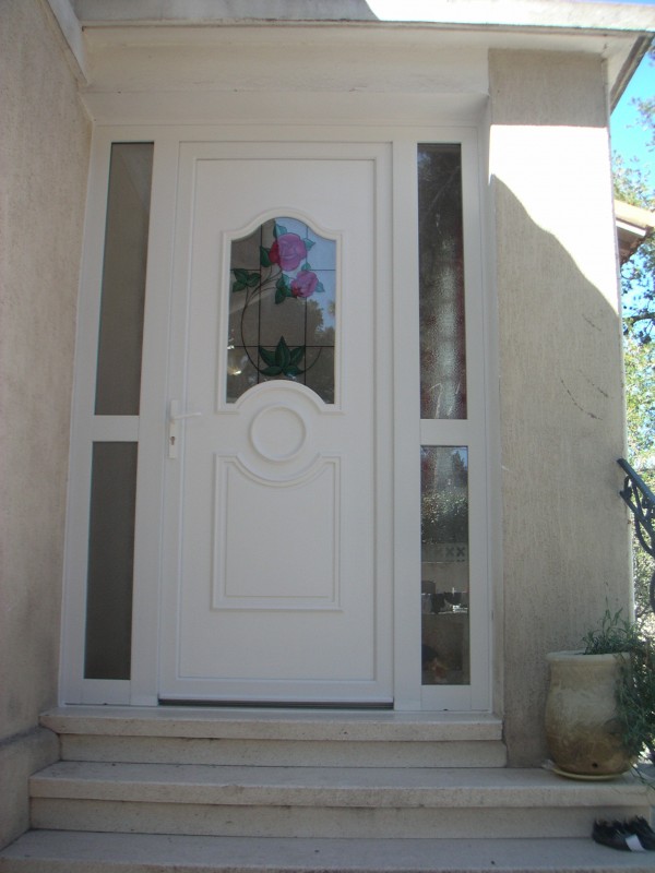 Remplacement d'une porte d'entrée bois par une porte d'entrée PVC Grosfillex avec fixes latéraux.